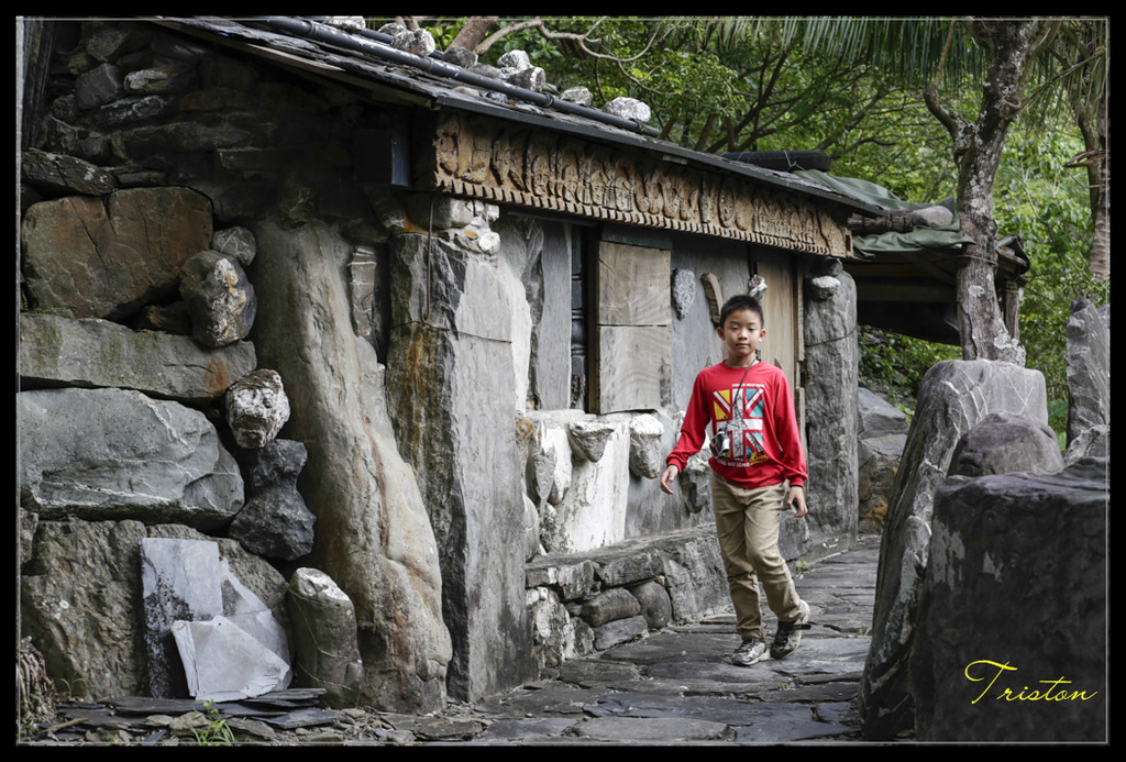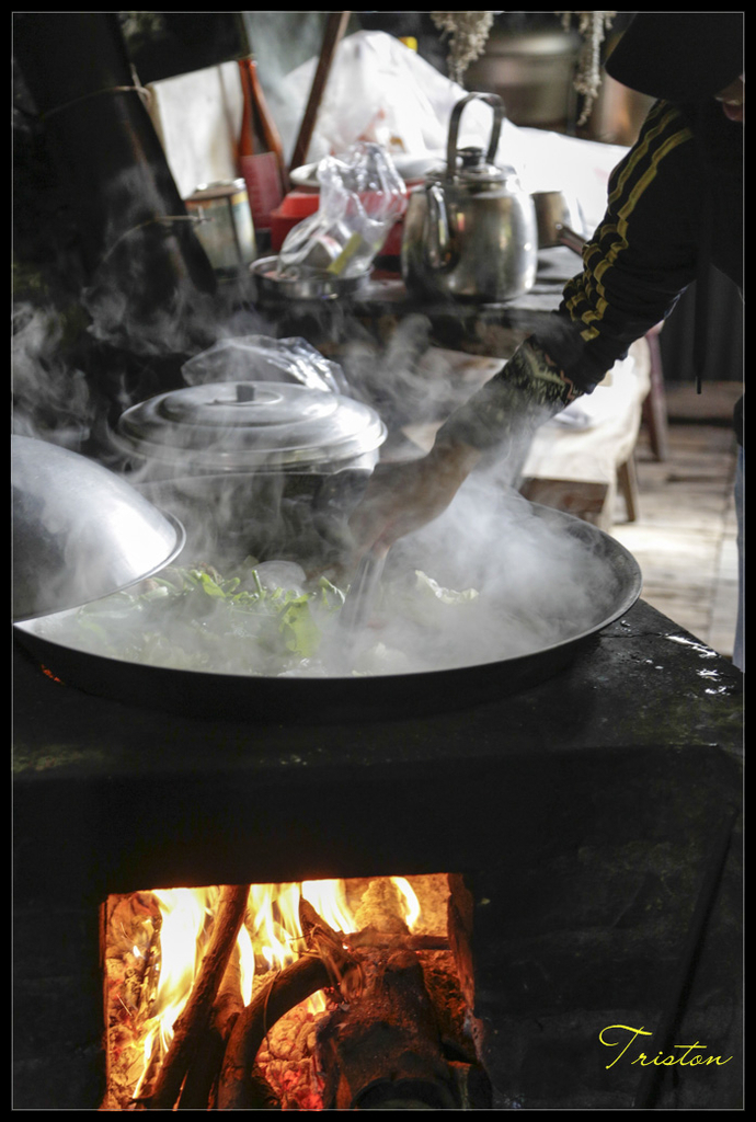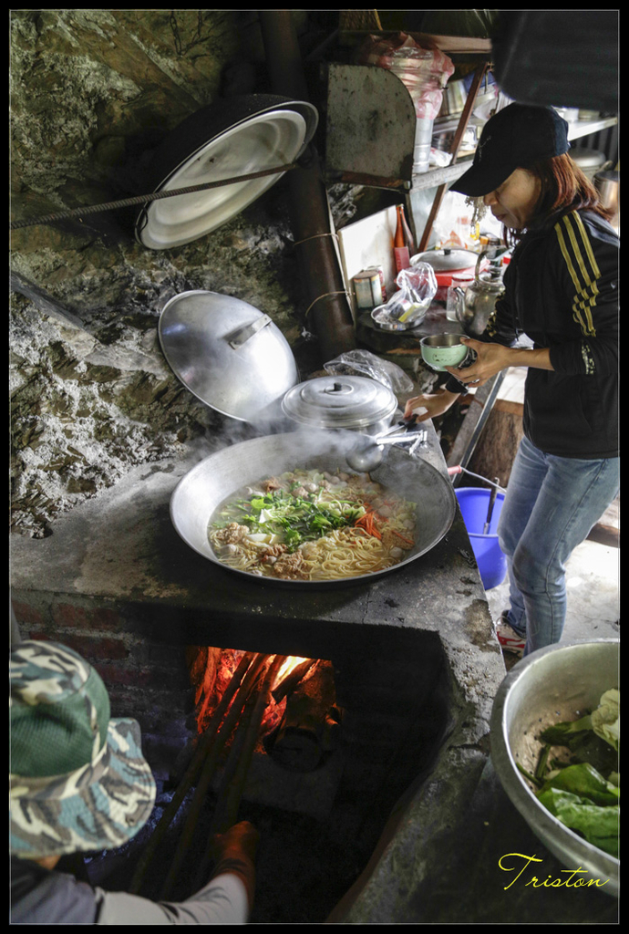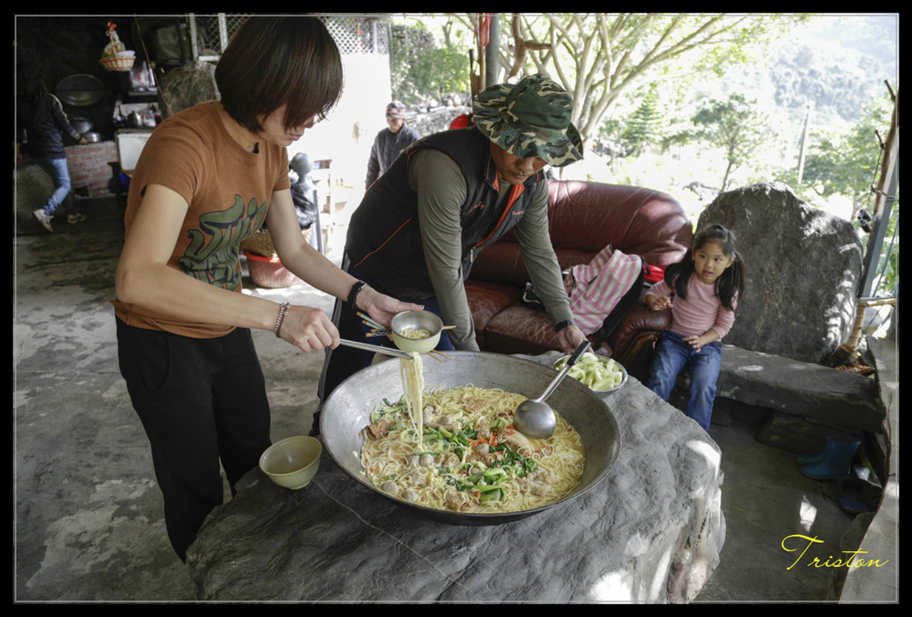 我們在納涼,裡頭的美英姐可正在準備午餐,燒柴下麵,那灶還是依著山壁的大石頭砌成的,這麼大的一鍋麵,吃得完嗎?