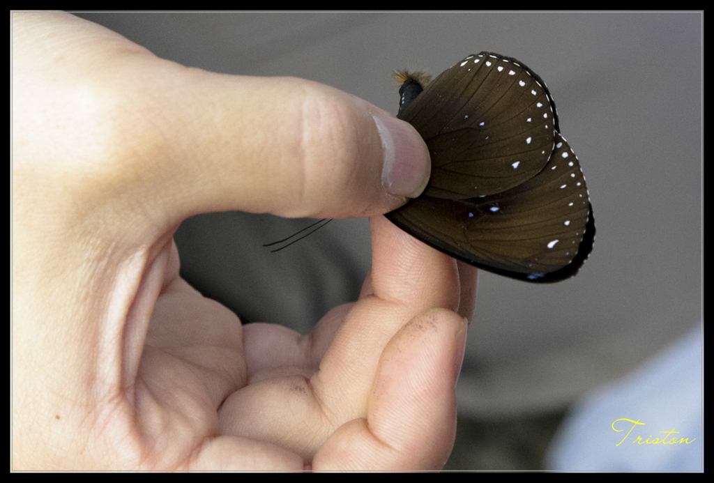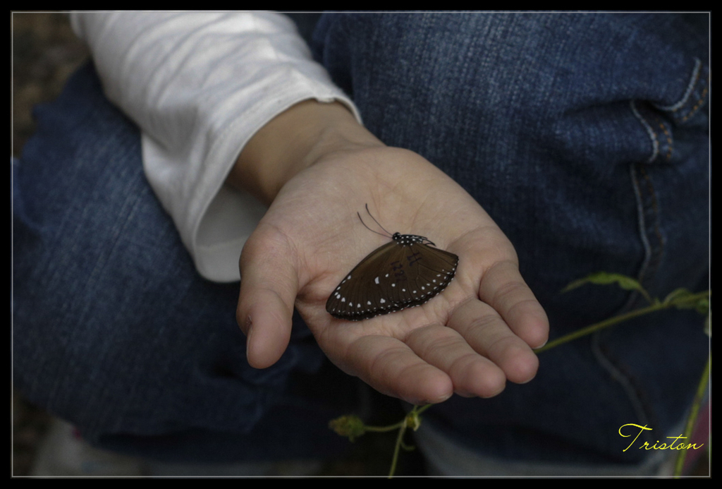 蝴蝶被捉後會呈現假死的狀態,放在掌心中也不會亂動,但只要一吹氣,牠就一溜煙地飛走了...