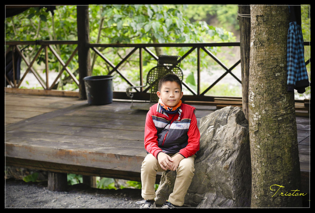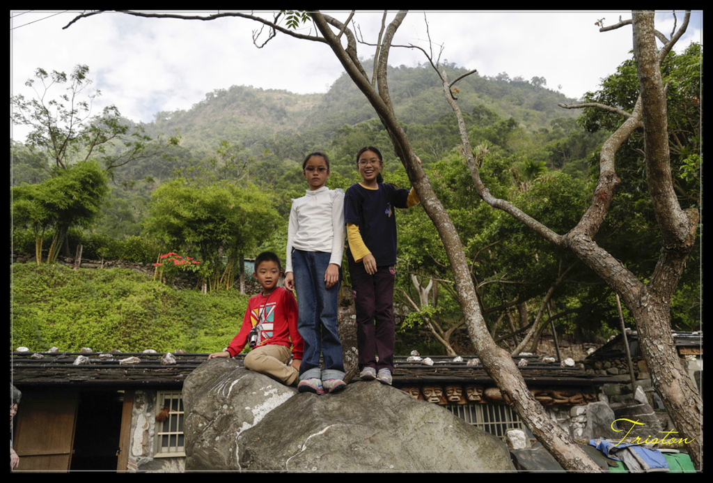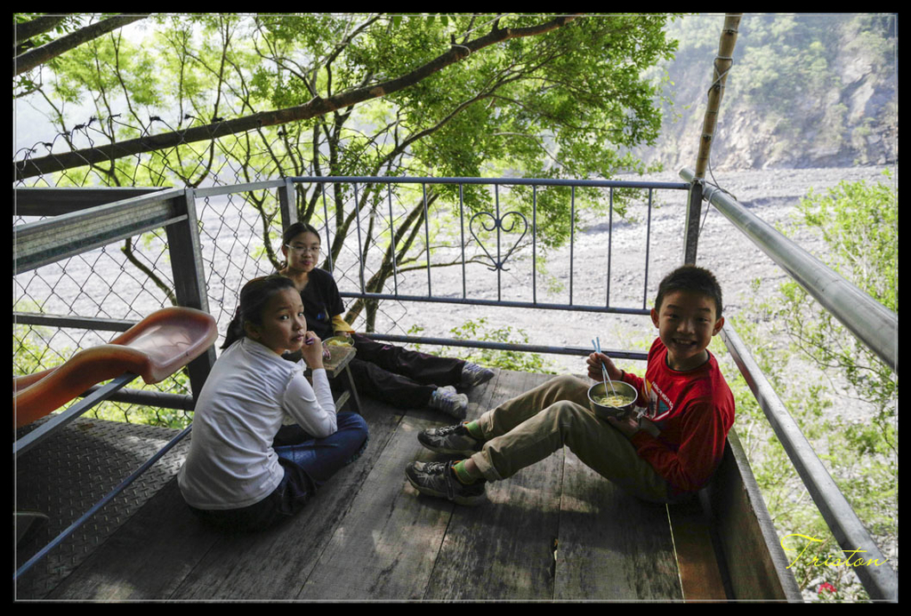 面著山谷的平台,小朋友在這裡大快朵頤,平常吃一碗的小朋友,在此佳景美地,都用了兩碗哦!對面的山谷聽美英姐說只是條二三米寬的小溪流,莫拉克風災,土石流使得小溪谷變成寬逾百米的石灘!