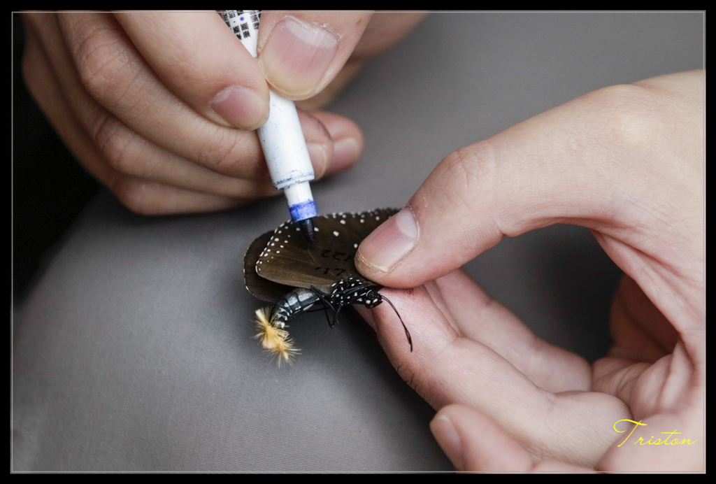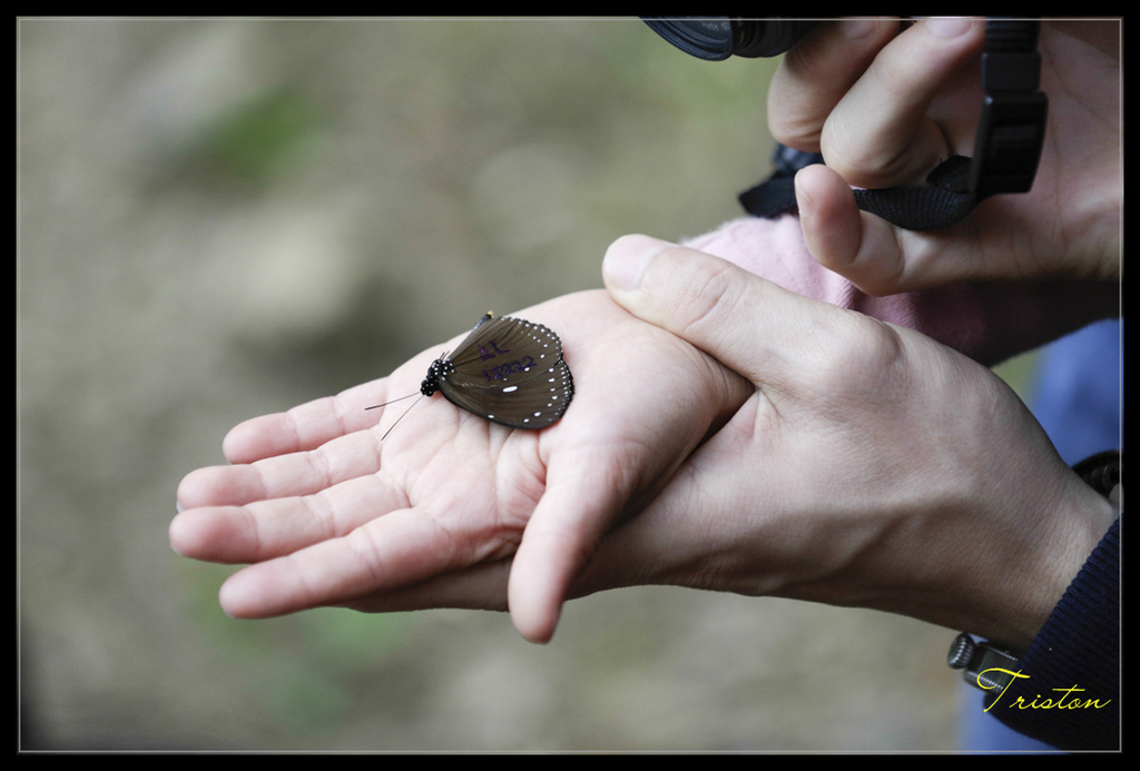用捕蝶網網了不少隻紫斑蝶後,用油性簽字筆在牠的前翅進行標放,並紀錄標放蝴蝶之性別,今天發現的大多是雄蝶(看明顯的毛筆器?)