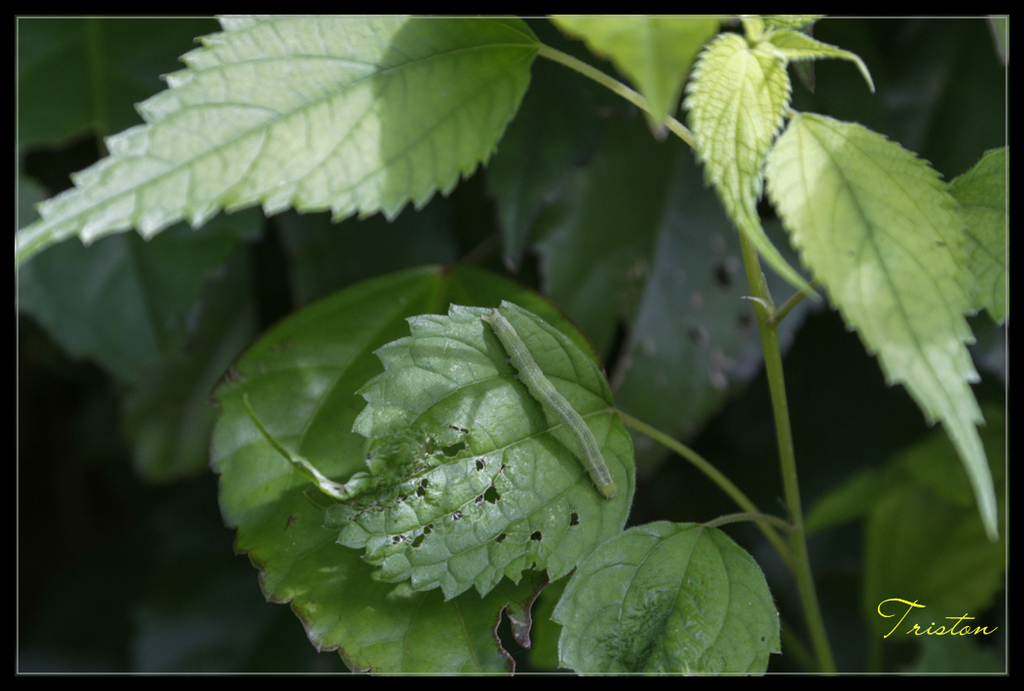 這是蛾的幼蟲"尺蠖"。『尺蠖』的名稱,來自其典型的爬行姿勢。是前後一伸一縮,中央拱成ㄇ字型。因為每步長度都差不多長,好像用尺在量一樣,故稱『尺蠖』!