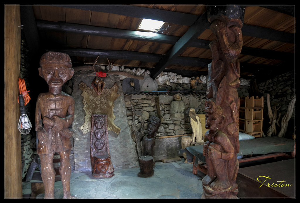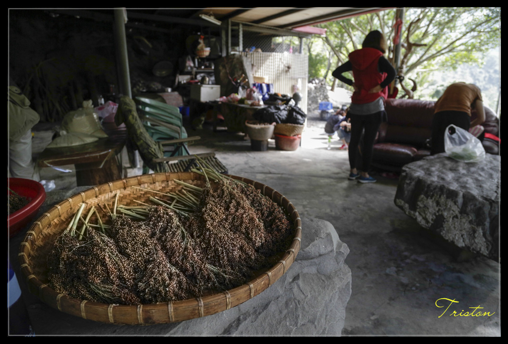 透風的廚房裡擺了不少河裡搬上來的原始大石頭做為桌面,擺上剛收成的高粱,晾乾準備日後釀酒!