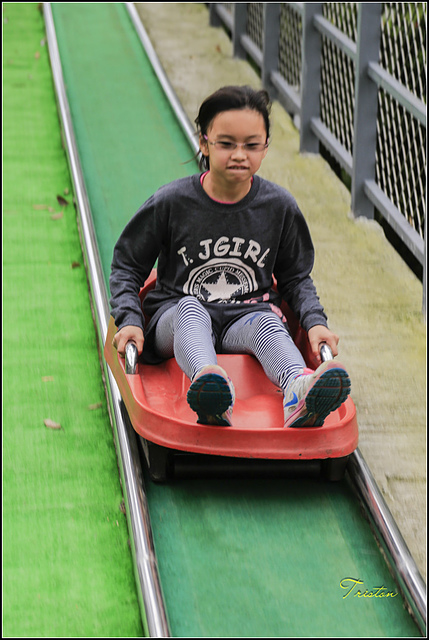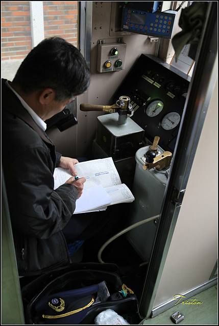 小朋友真的很厲害,立刻搶占火車前頭觀景第一排。駕駛員己經領了路牌,等時間一到就要出發。