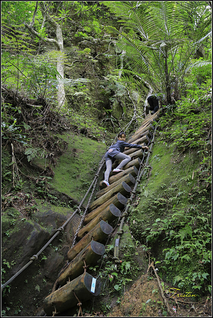很抖直的木梯,大約有十來公尺,分兩段,前半段是木梯,後半段則是石壁上面鑿出來的階梯,小朋友們一馬當先,絲毫沒有忸怩態
