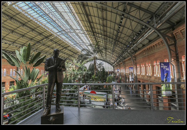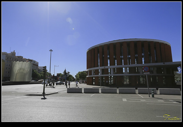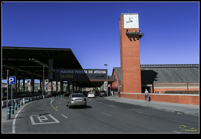 哦!才發現,原來它的站體大多地下化了,左前方的白色玻璃塔竟然是馬德里火車爆炸紀念塔,這是西班牙政府為了悼念2004年3月11日發生的舉世震驚的爆炸案,造成192旅客罹難1824人受傷。因此為“FAM Studio”設計,在馬德里火車站前,圓環廣場中地鐵站的上方¸,豎立一座11公尺高的圓柱狀玻璃塔。只是當時真的不知道,以為只是普通的通氣塔,真是失敬!失敬!
