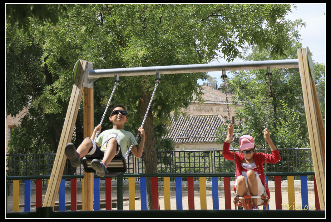 路旁又出現公園,小朋友二話不說,又衝上去了,西班牙的盪鞦韆真的很好玩,而且有各式各樣的座椅