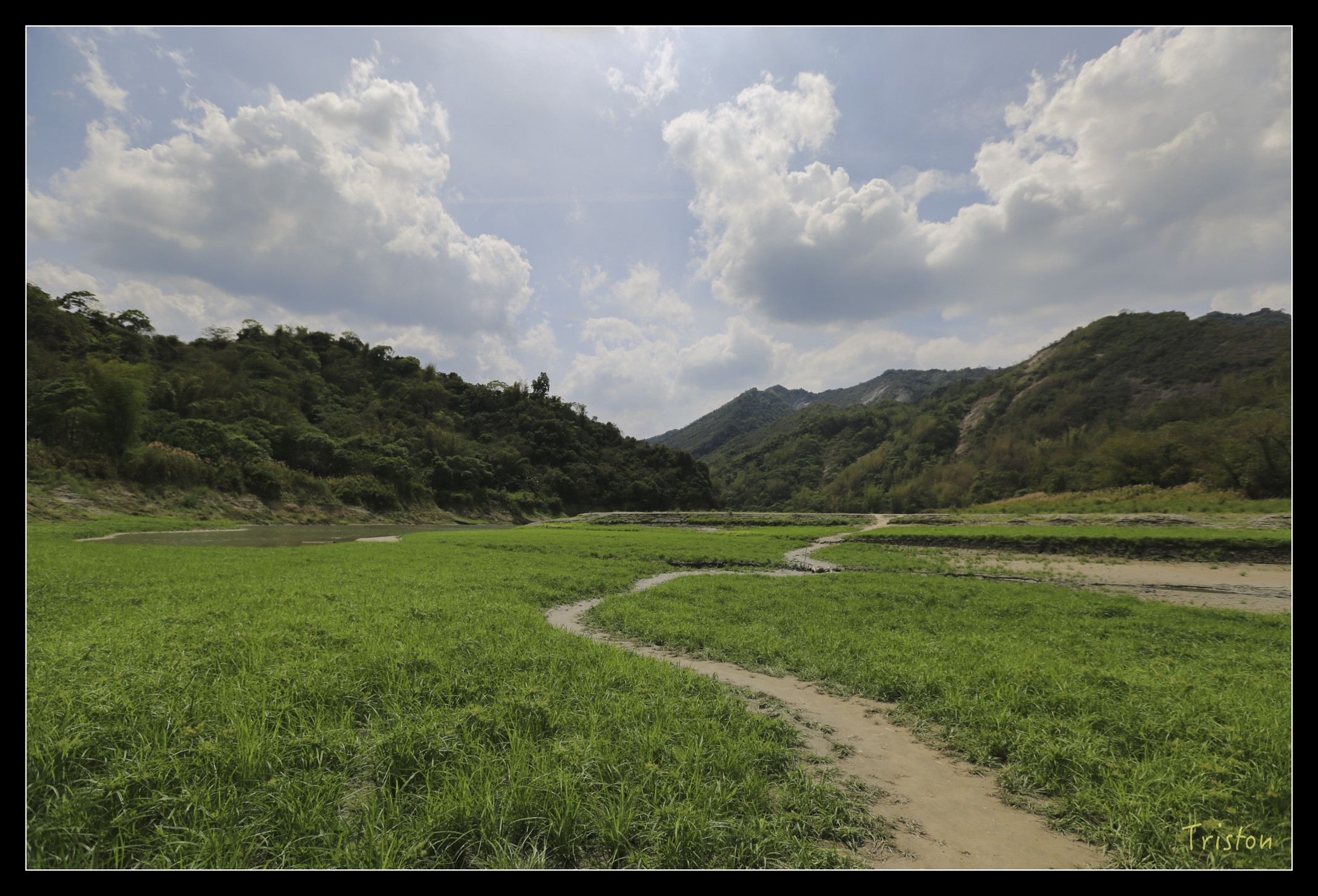 過了獨木橋,大約還得走500米才會到谷口,不時可以看到乾裂的泥地和因為有水滋養生生不息的綠草皮