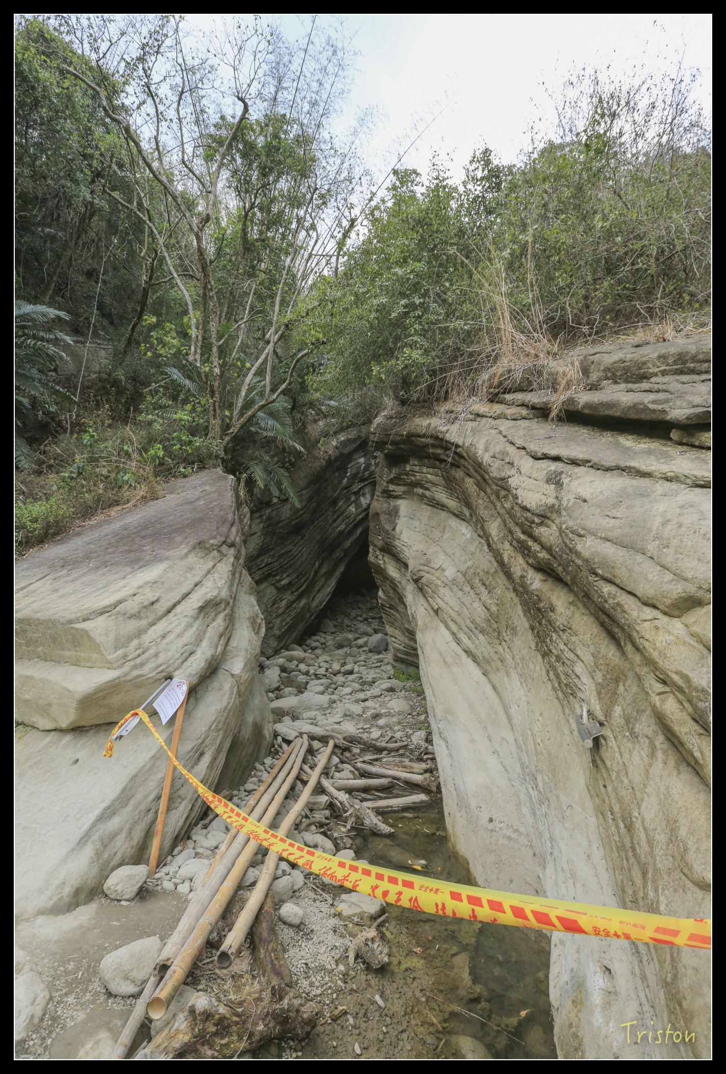 谷口不大,僅約一米多寛,但有公告和黃絲帶,沒錯就是這裡!明知山有虎,偏向虎山行啦!