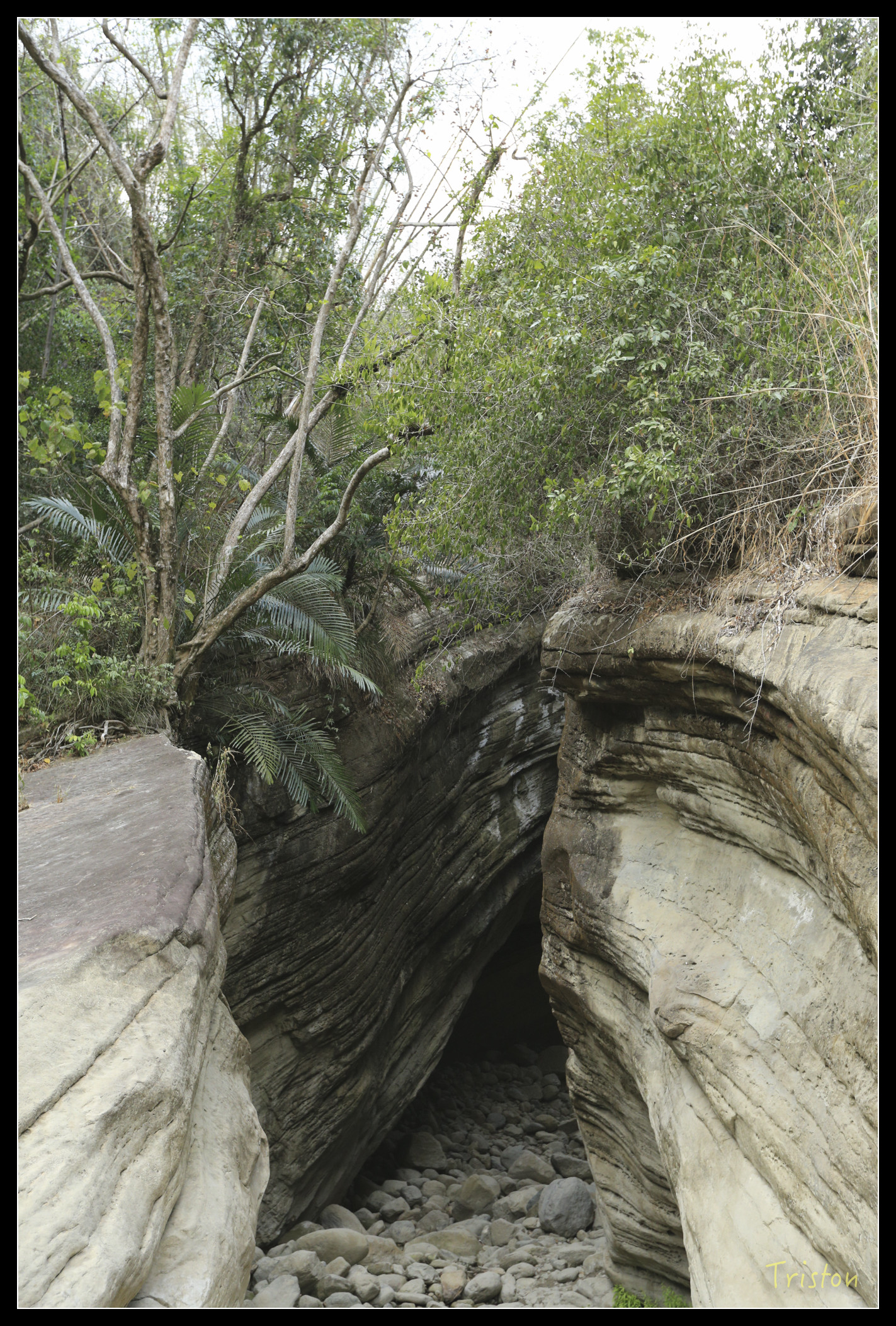 入口方向,因為這裡呈袋狀,所以聽說日據時代曾有大批抗日分子避逃至此,然後被日警屠殺於此;又曾聽說幾十年前有成大學生在這裡集體溺斃的事件,總之,這裡是很危險的
