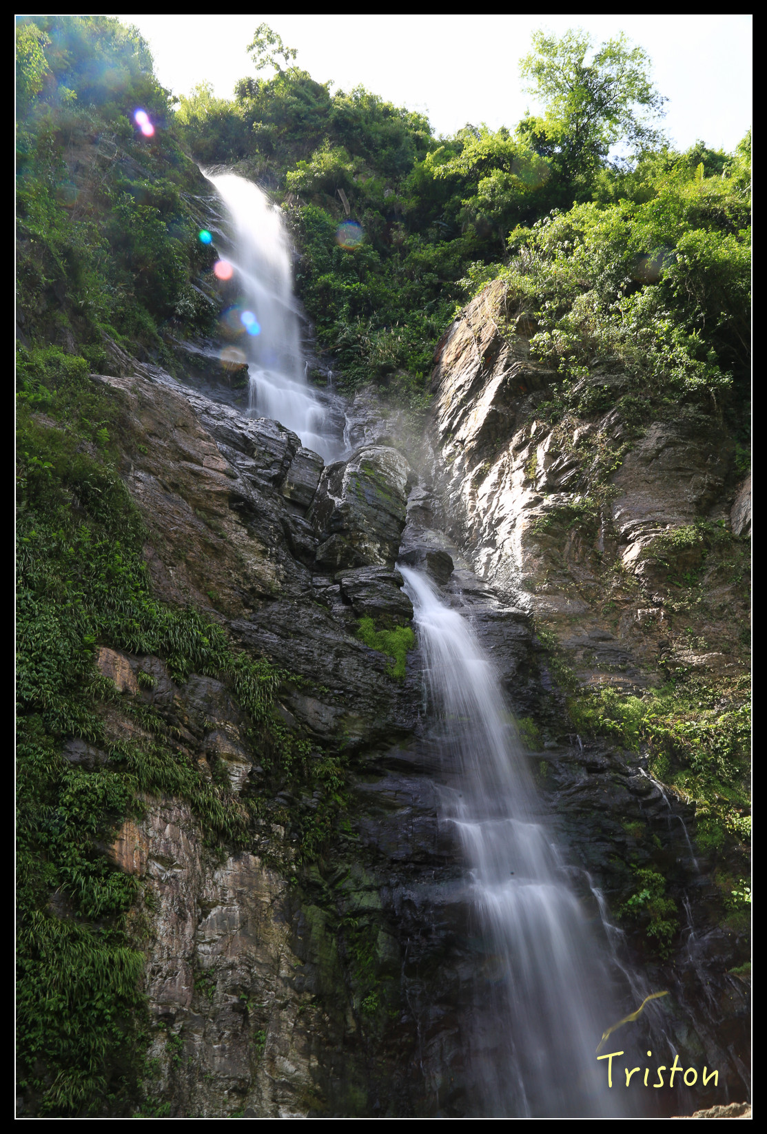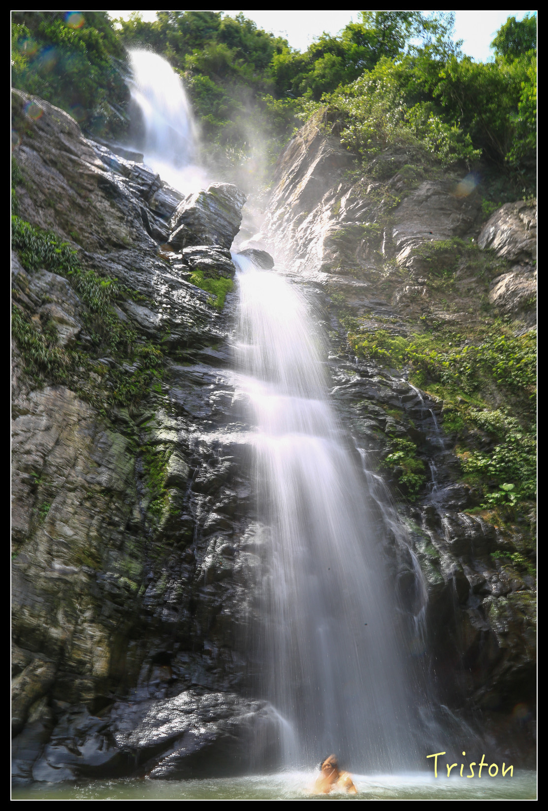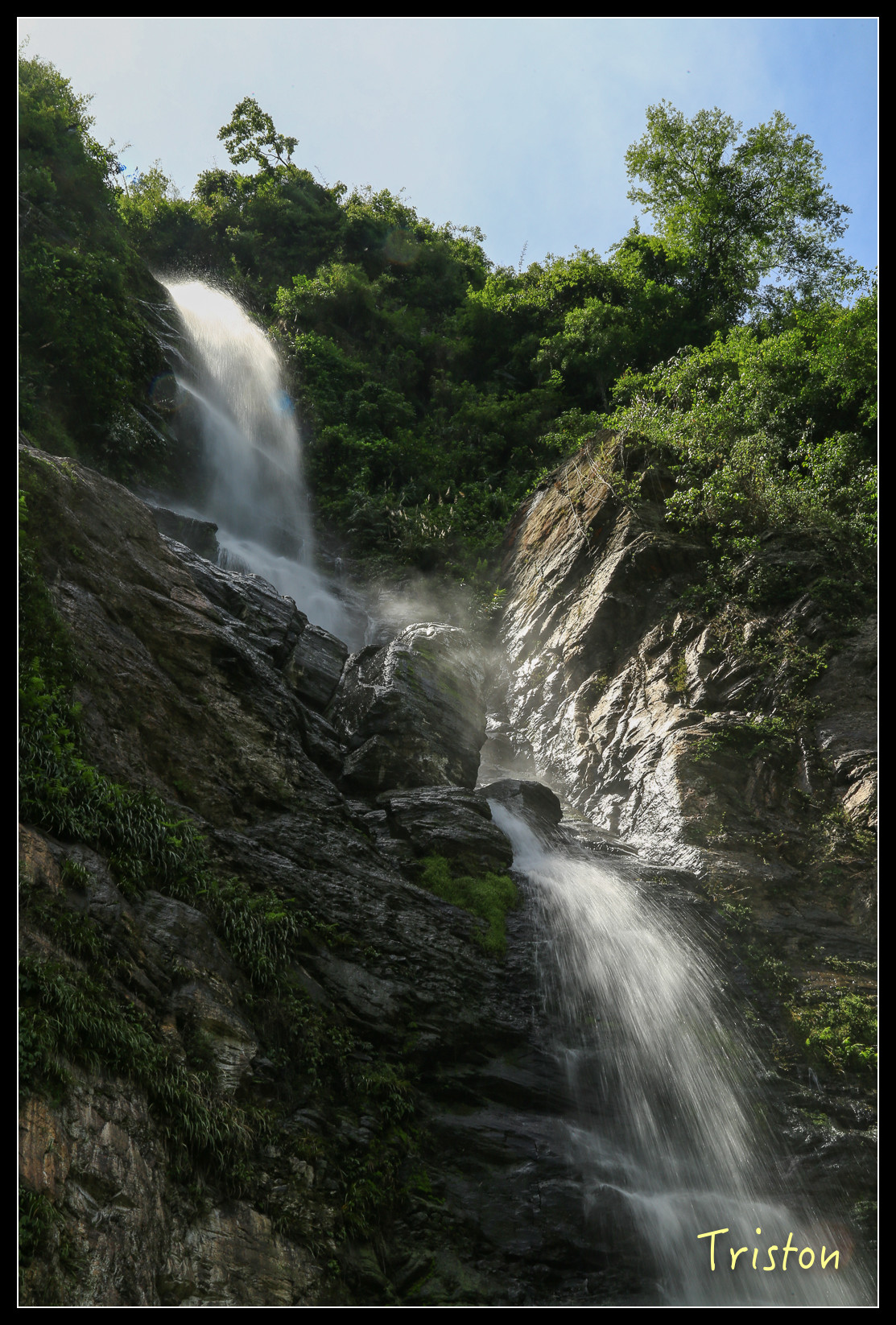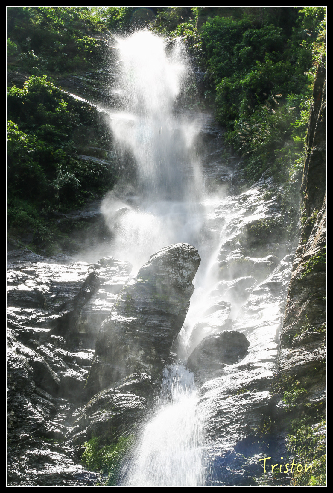 就在眼前了,高約五十米,雖然中午時分,但躲在陰涼處,瀑布下沖濺起的水花讓人挺涼快舒服