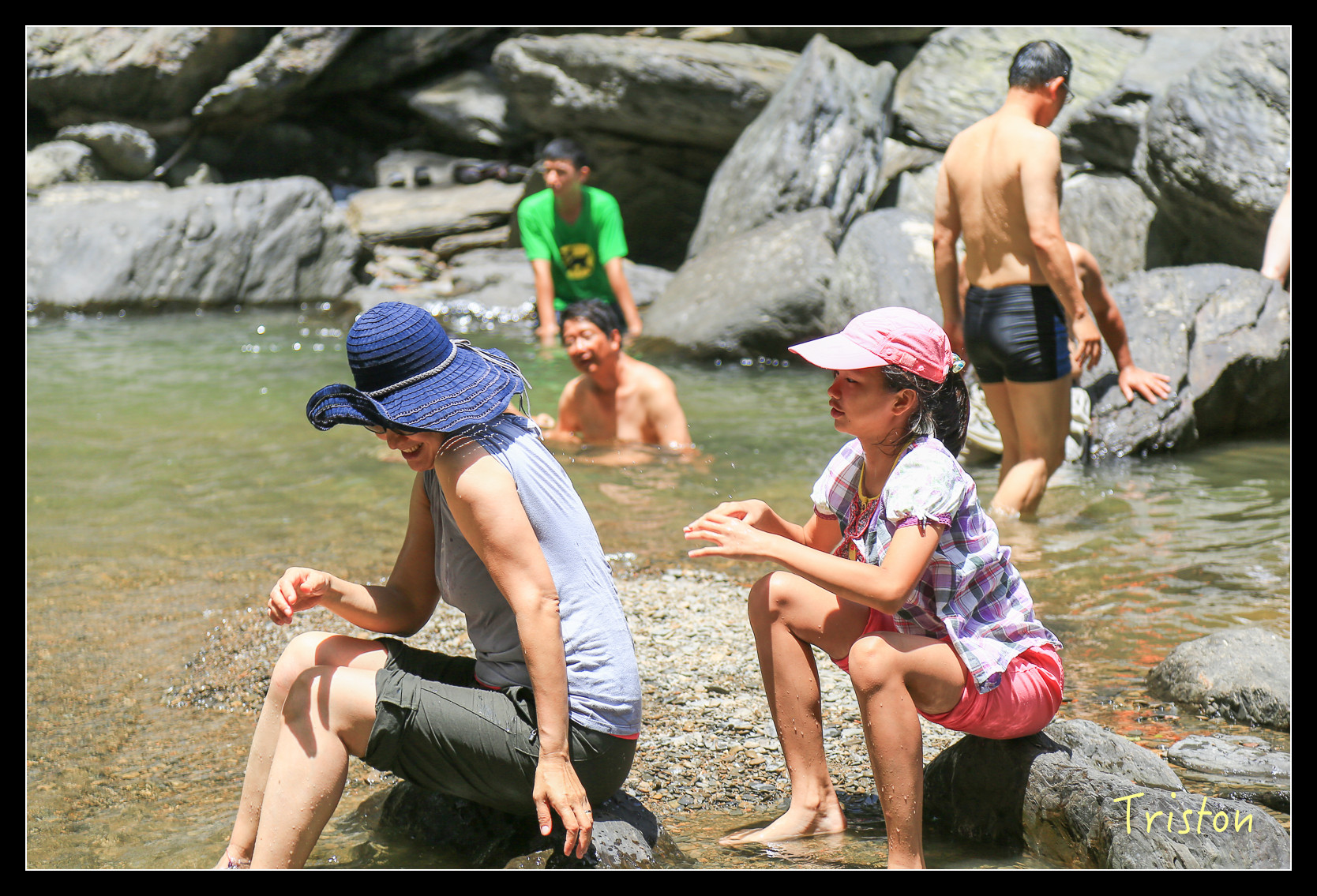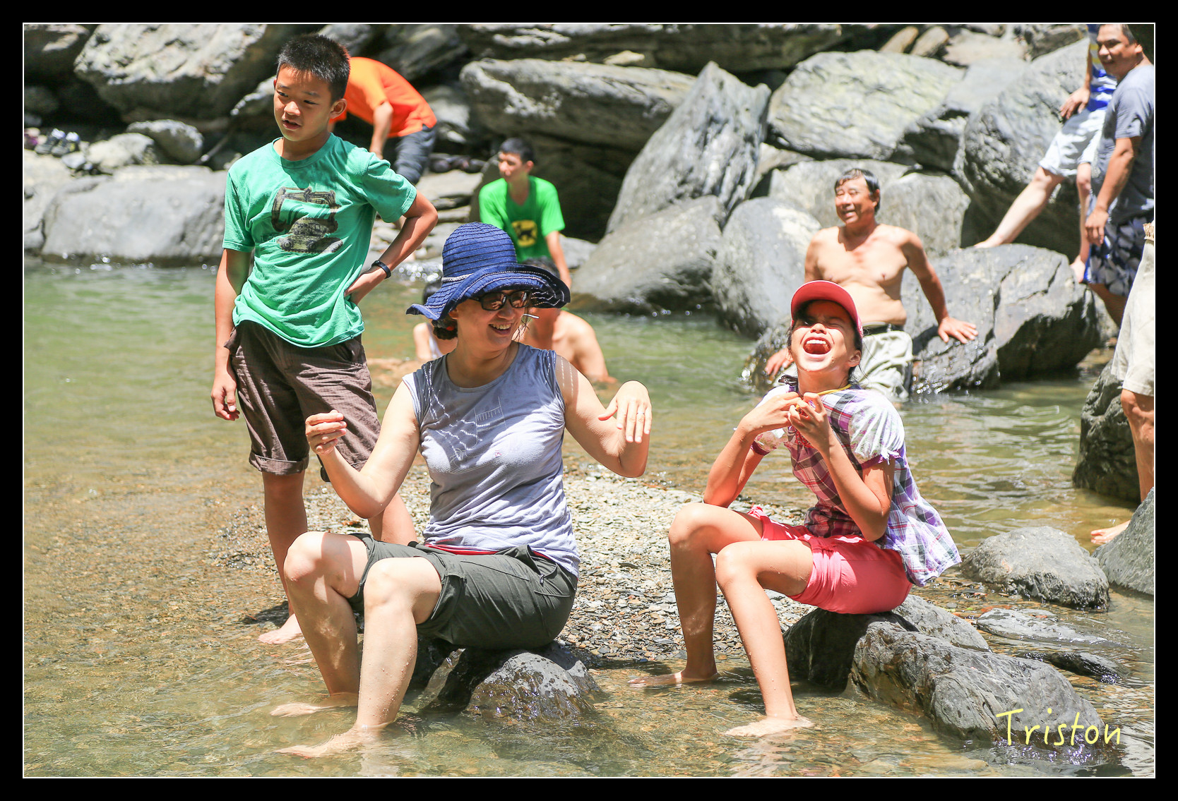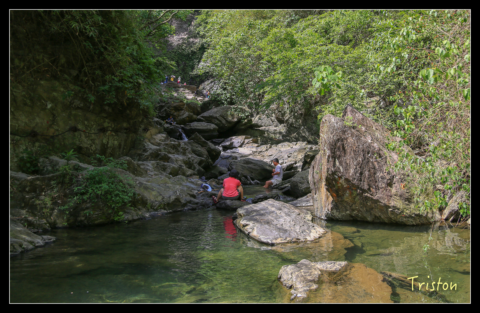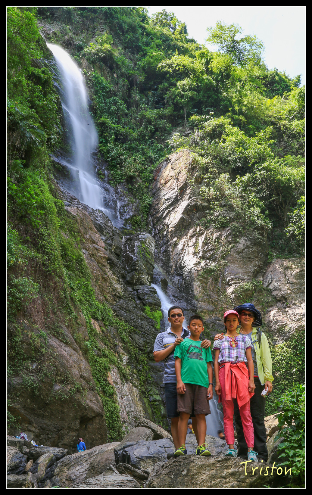 瀑布底下有一水池,來了不少家庭和大學生,在潭裡嬉戲!我們只在水邊泡泡腳,有時反省,會不會我們太過矜持,少了點熱情和衝動,這樣對小朋友到底是好還是不好,人家說"人不痴狂枉少年",我是枉少年了,但總不能讓小朋友也枉少年吧!?