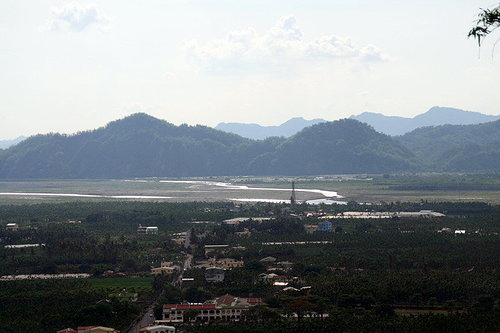 走了一段路,視野也漸漸開拓了起來,蜿蜒的荖濃溪在午後的陽光下泛著魚鱗般的閃爍亮光,好像倚天屠龍記張無忌的菩斯曲蛇一樣,通體金光,遠方的旗山山腰(是十八羅漢山嗎?)點綴著橘紅色的鳳凰花,像是山林間的野火,卻更像秋後的楓紅