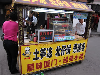 突然看到有一家店,有一個小姐長的挺不錯的.其實我們是被她的背影吸引過去的.不過來不及拍到咧....她是在買一家號稱"廈門漢堡"的夾餅,看起來還不錯,我們向來鼓勵嘗試新鮮東西的,當然就義不容辭了.