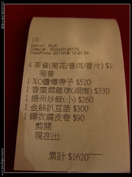 揚州炒飯,粒粒分明,上面還有小撮干貝絲。看來簡單的東西其實最看的出工夫了,雖然粒粒分明,但吃起來卻不覺得乾澀,吃了以後也沒有口乾舌燥的"味精"味。每次全家來都會點這道,即使沒吃完也會包走的美食。