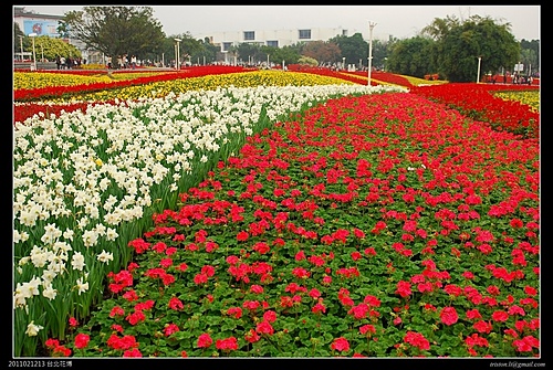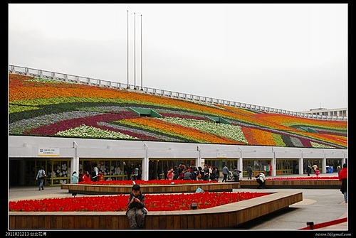 中山足球場看臺的七道彩虹區-擔心排隊的人太無聊,在隊伍的對面視野剛好看到花海舖成的七道彩虹,也算煞費苦心啦!但是我是後來才發現原來到中山足球場內是不用排隊吔!我排的爭豔館是要進去館內看花卉競賽