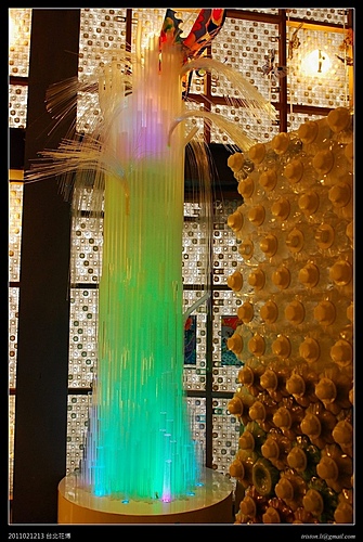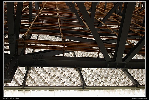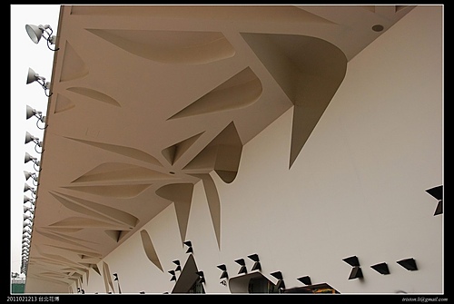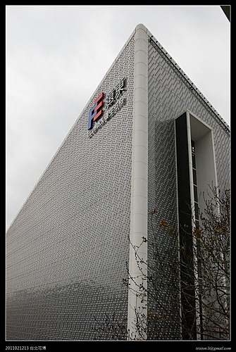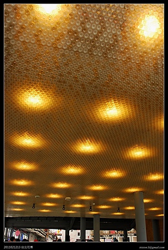 挑高透風的一樓,講解說是向東北開口,可以迎接東北方向來的季風,外牆還有由高處向下流落的水幕,可以產生降溫的效果,當然2/13那天蠻冷的,水幕也沒開啦!經由重新壓出成型的寶特瓶搭成的外牆,現場看壓製後寶特瓶沒有看到明顯的卡榫,不了解它的扣合是用結構扣合,還是要另外上膠呢?而且重新壓製,不知道會不會有反而使用更多能源的問題,如果一開始做為容器使用前,就可以設計成回收待用的結構?例如像樂高積木的概念,會不會讓日後回收及再利用有更寬廣的使用空間?不過透過使用PET再生使用的概念蓋成的這樣一棟大型建物,的確可以提供新一步的建築思考,例如組合式機能型隔熱建材的應用....還挺有趣的....現在做資源回收的都會賺大錢吔!!人棄我取!還可以發錢當首善哦!