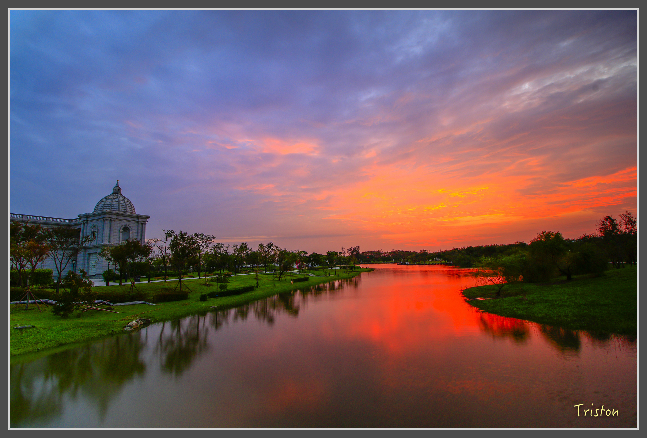 20160929 梅姫颱風遠颺,梅姫又比莫蘭蒂凶狠,果不其然,隔兩日的火燒雲也比兩週前聲勢更驚人,週四下了志工值勤,出了車道,頗有感覺,連忙取了腳架,背了相機,往奇美博物館旁奔去,就在立好腳架,備好相機一剎那,紅雲蔽日,輝映水面