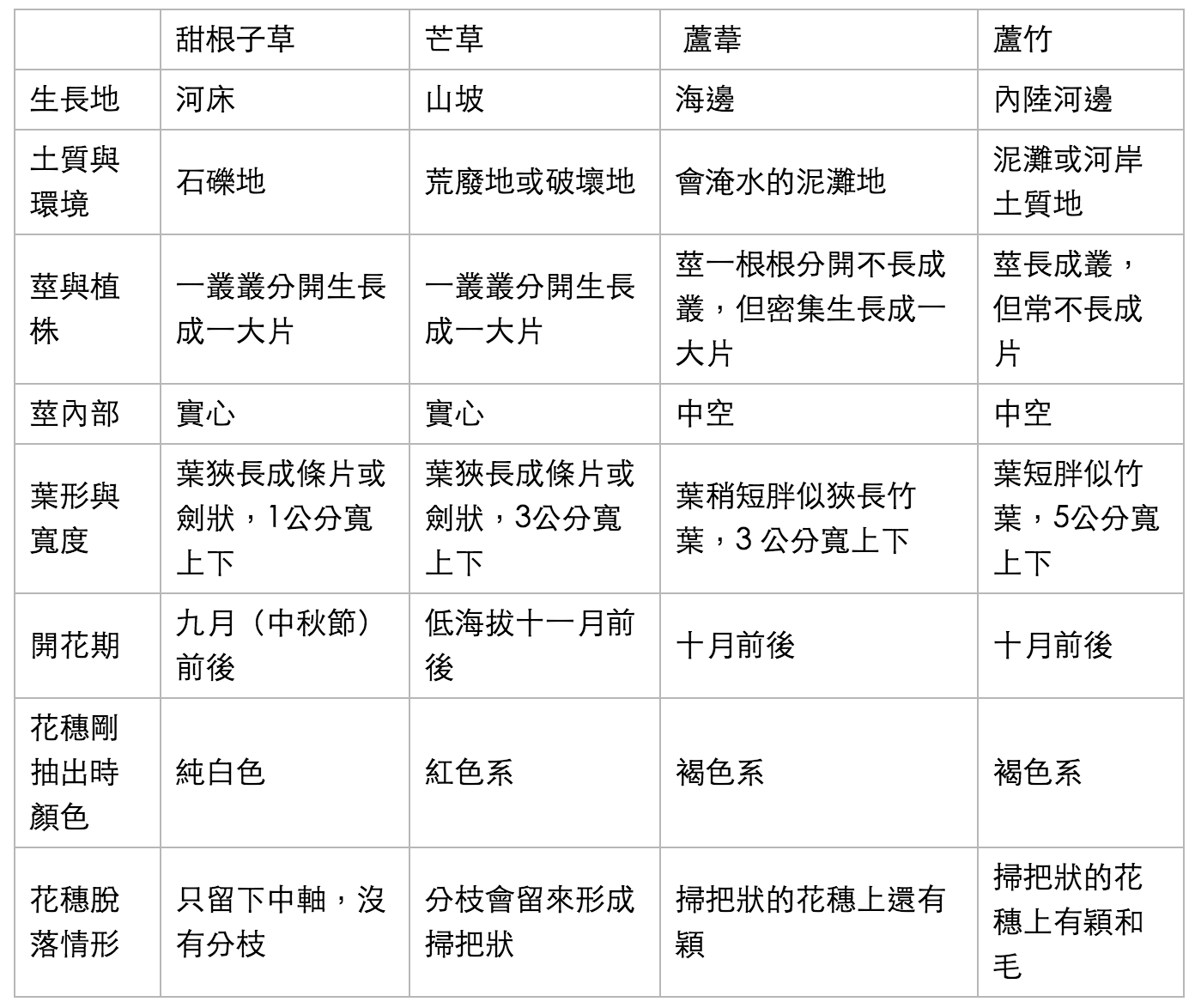 甜根子草常和芒草、蘆葦、蘆竹分不清,網路上還有人作一分類表,可作對照