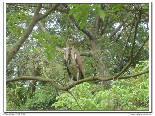 突然樹上出現一隻大鳥,猛一看牠飛過來,還以為是什麼梟或鵰咧!我是金庸的武俠小說看多了.哪來的鵰!後來問老板娘,才知道牠叫”黑冠麻鷺”,巢就築在營本部前,前幾個月生了三隻雛鳥,大鳥一不小心轉身就把一隻雛鳥推落樹下,摔死了;前兩天下雨,又冷死了一隻,所以現在只剩下一隻,大鳥在巢附近也不敢飛了,小心翼翼地走路,遠看倒像是隻貓,還得遠離鳥巢才敢振翅咧!