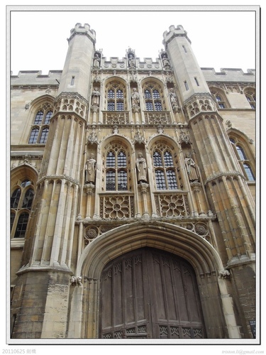 三一學院正門,如果仔細看的話,可以發現亨利八世右手上拿的不是權杖,被學生換成一枝椅腳