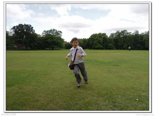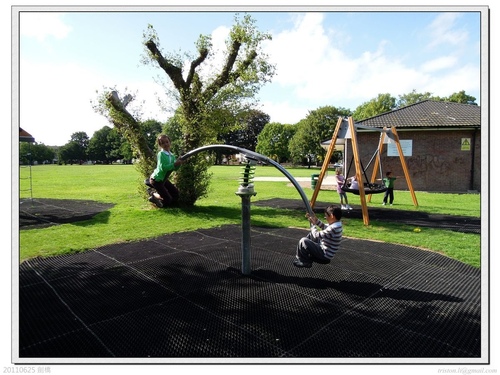 教堂的對面是一大片綠意盎然的公園,五點多的傍晚(其實也不是傍晚,因為十點才天黑),社區的小朋友都和爸爸媽媽出來玩耍,我們這兩個也不落人後的去體驗一下英國兒童的遊樂設施