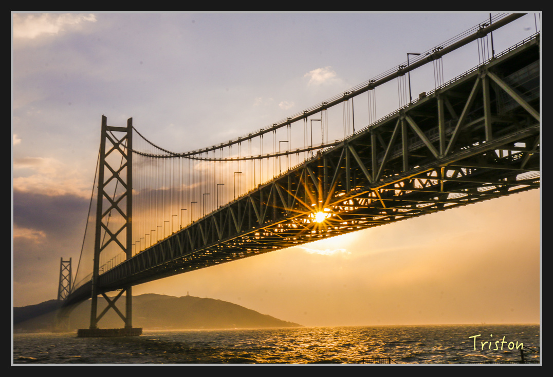 從一旁的舞子公園,遠眺雄偉而美麗的明石海峽大橋,沐浴在夕陽下
