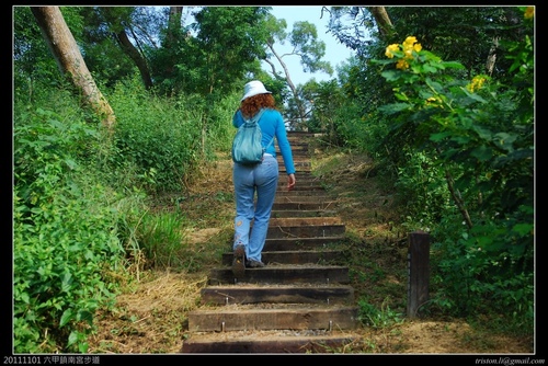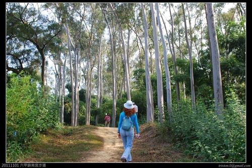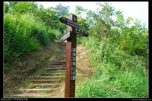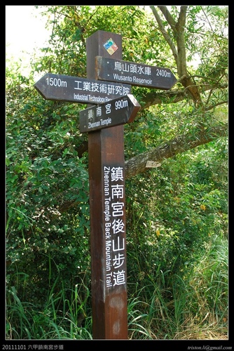 台南市六甲區鎮南宮後山步道就是以前的赤山步道,由鎮南宮依指標進入後山步道整建後的步道約990公尺,走到檸檬桉樹林的步道尾端,右通烏山頭水庫、左到工業技術研究院南部分院!