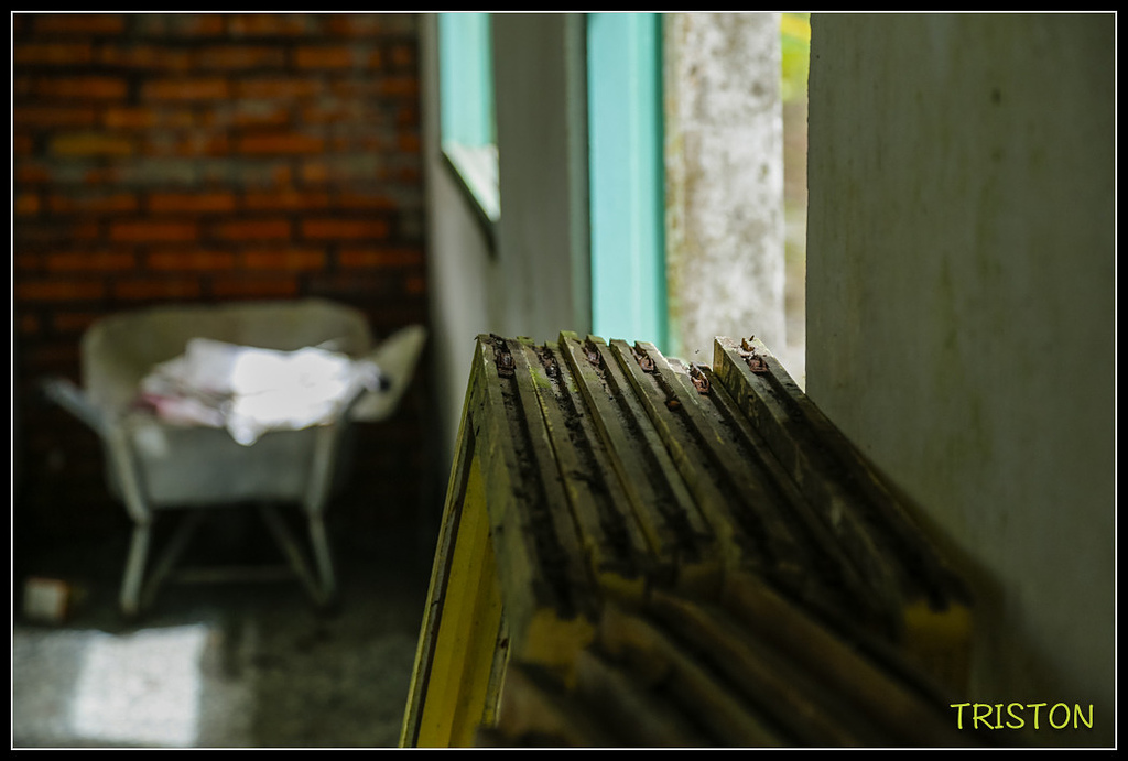 室內窗框被卸在一旁,有一手推車,這裡也曾是工程人員的休息之處
