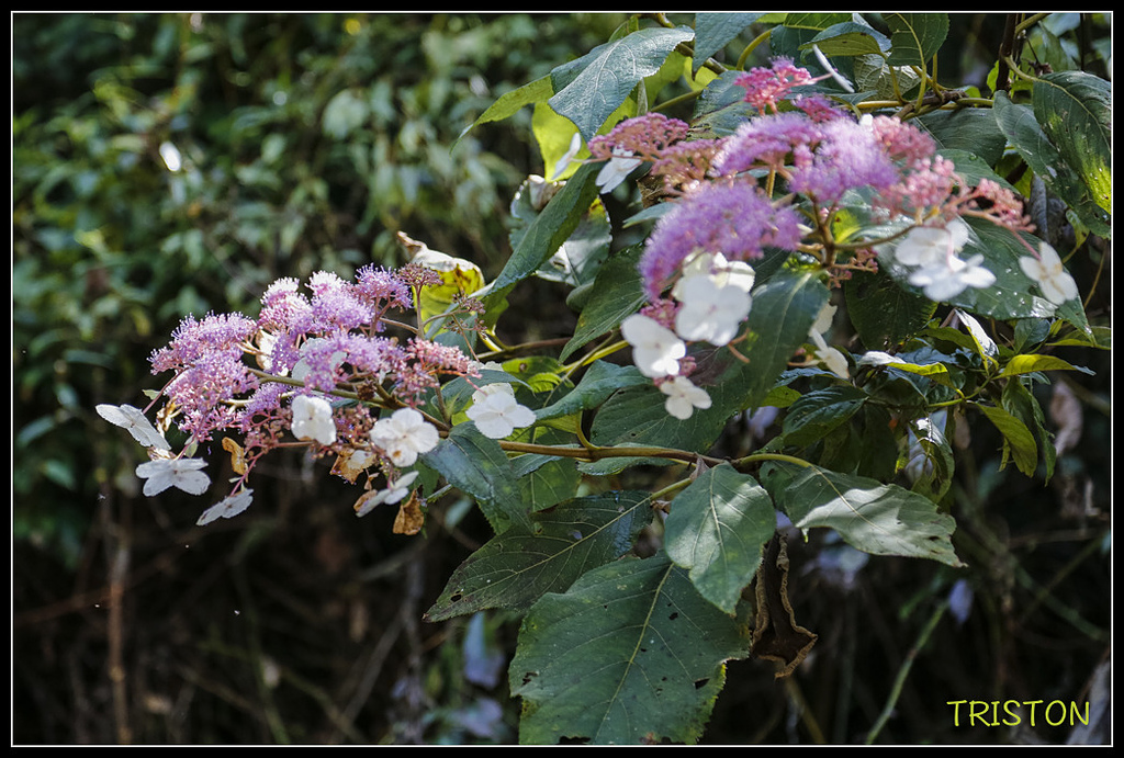 華八仙科的高山藤繡球開著紫色的小花,白色花朵像雙隻飛舞的蝴蝶,讓人眼睛為之一亮,讓這片寂靜的山野充滿生機。華八仙科有個相同特徵-瓣化之不孕花(白色)圍繞在可孕花(紫色)的外圍!很酷!不孕花和可孕花各司其職,肩負起延續DNA的重要使命!不禁想到以前禮堂旁的聯句:生活的目的,在增進人類全體之生活;生命的意義,在創造宇宙繼起之生命。