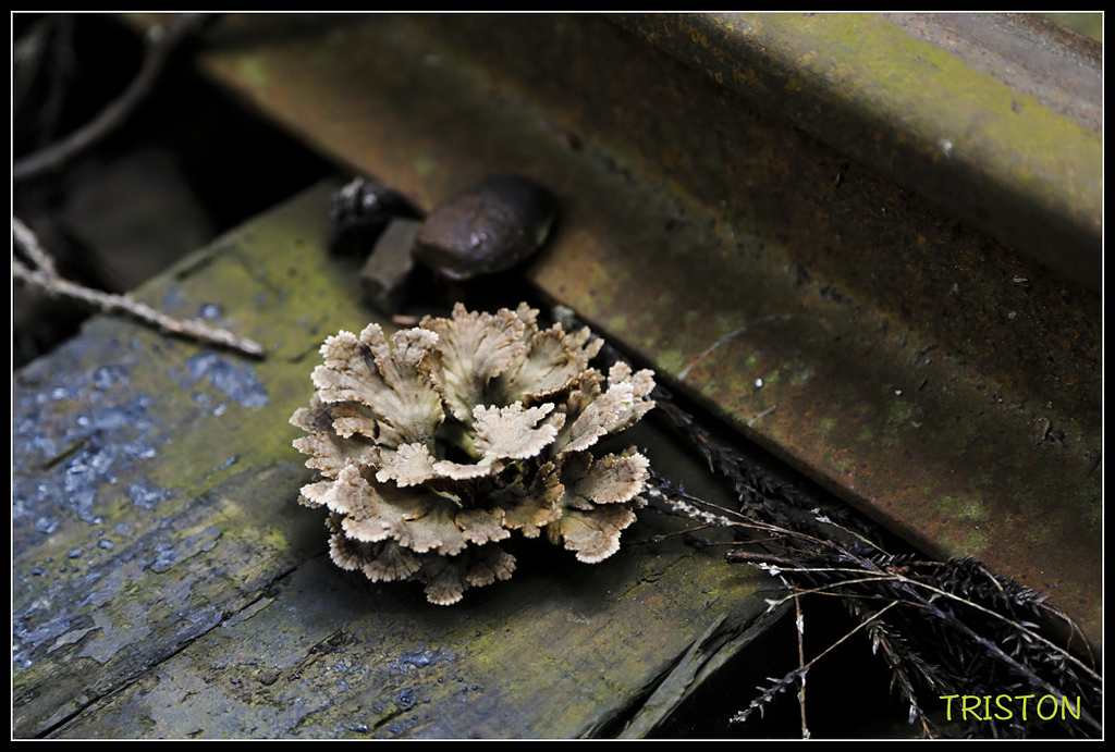 軌木上道釘鐵軌旁長了一朵灰樹花,據說灰樹花有輕微毒性,食用後毒性發作時人會手舞足蹈,故日文中稱灰樹花為舞茸