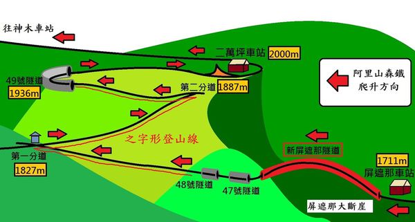 3.之字形折返路線(Switch Back;Zig Zag):屏遮那往二萬平站的第一分道和第二分道段、神木車站