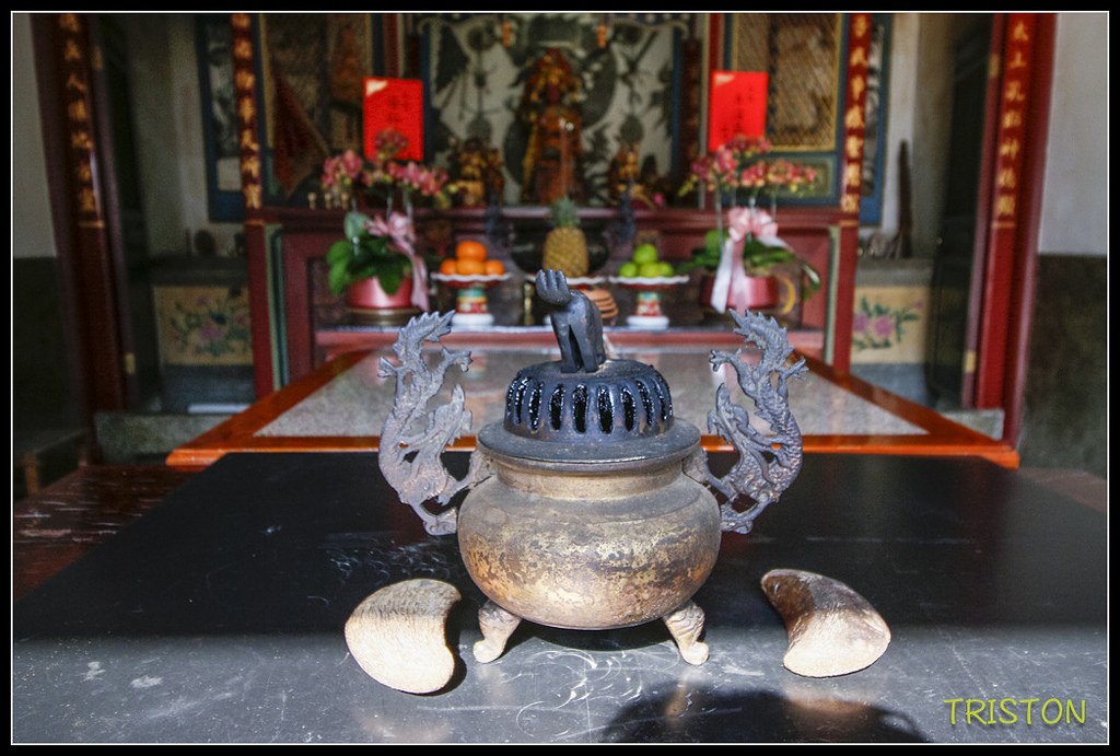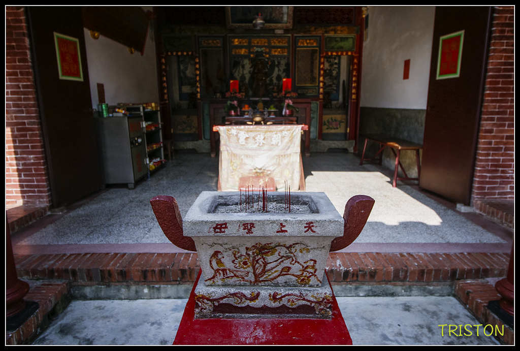 朝林宮原本供奉中壇元帥〈三太子爺〉, 但是日治時期,總督府不准民間供奉男性神明(?),於是廟方只好請來媽祖,其他神明暫由信徒請回家中供奉;這段時間,朝林宮被當做民生及軍用物資倉庫之用。甚至後到最後,被認為是一間客家庄的媽祖廟....若不是了解這段歷史背景,看到廟中的這座石製香爐實在會讓人一頭霧水。