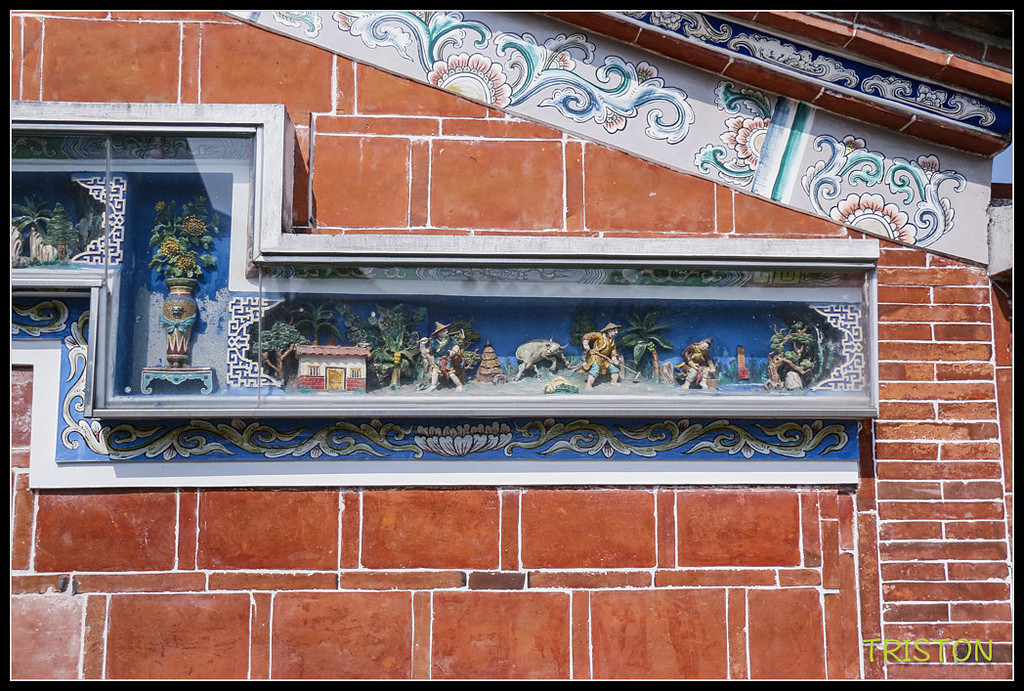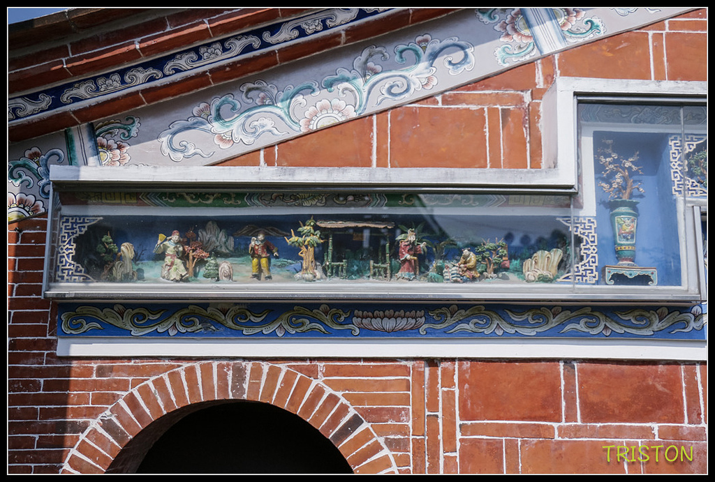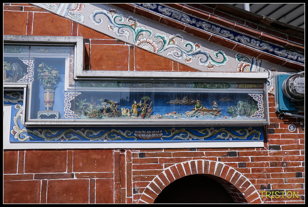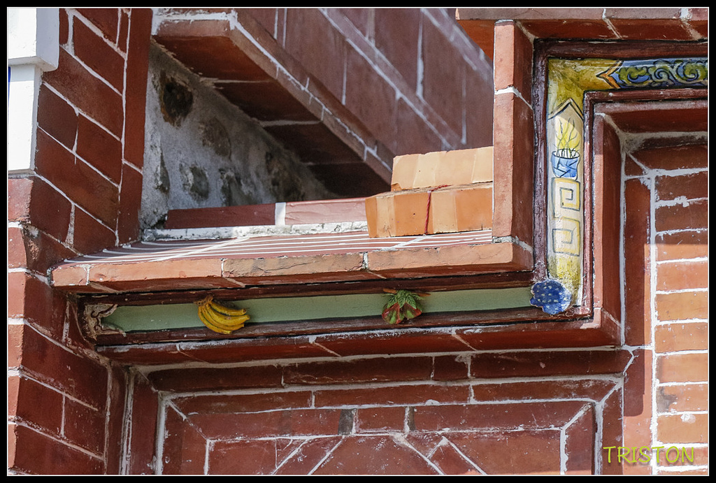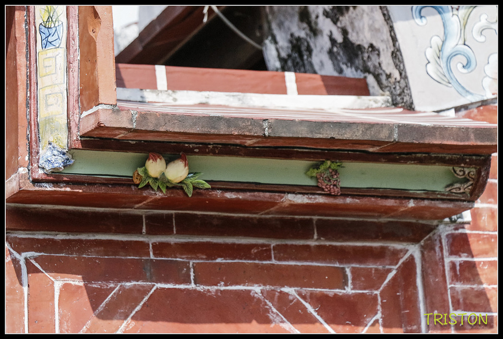 左過水廊門肩的交趾陶作品,有桃子、葡萄、香蕉、蓮霧......等水果,很可愛