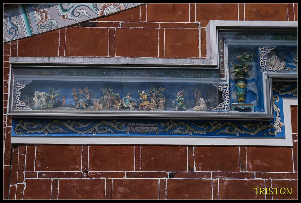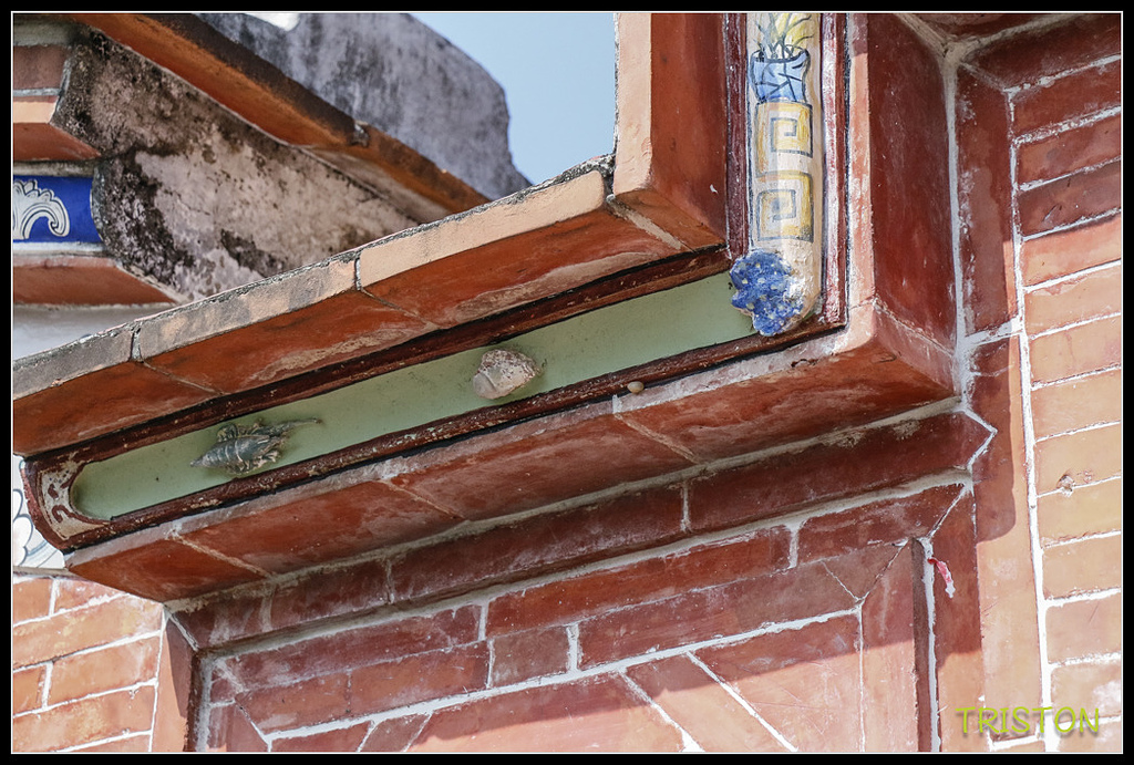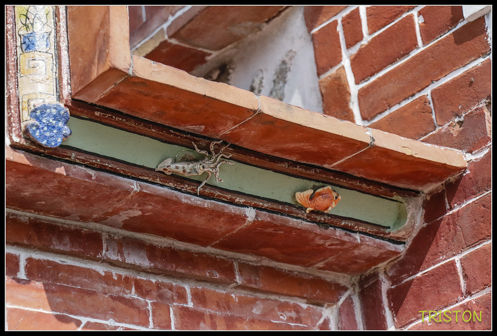 右過水廊門罩下有很可愛水產類交趾陶,感覺令人玩味,一般蟹有登科甲之意,花枝與蚌就較少見