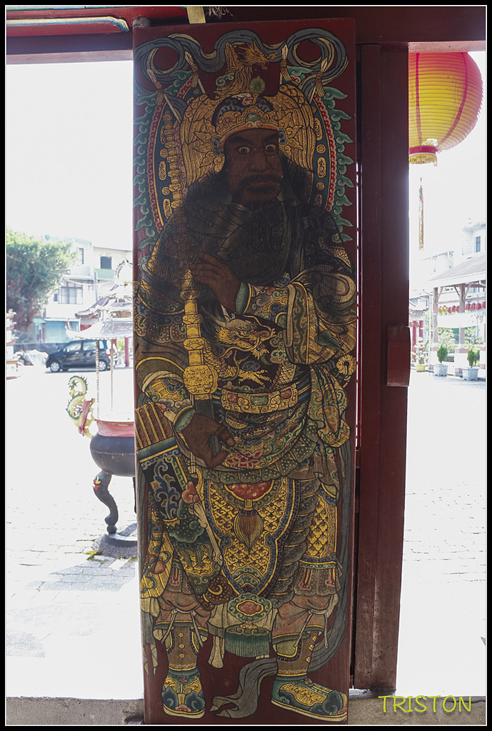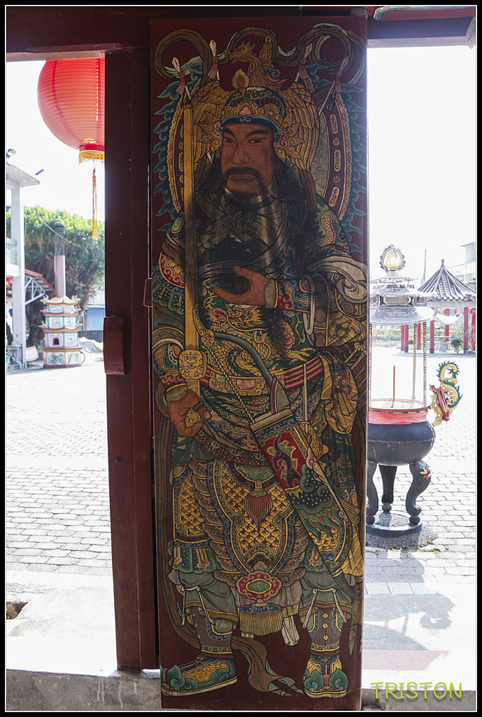 門神彩繪,右門扇手執鐵鞭、腰佩箭袋的應是尉遲恭將軍,而左門扇上手執寶劍、腰佩箭袋與弓的應是秦叔寶將軍,由修復師李志上負責修復