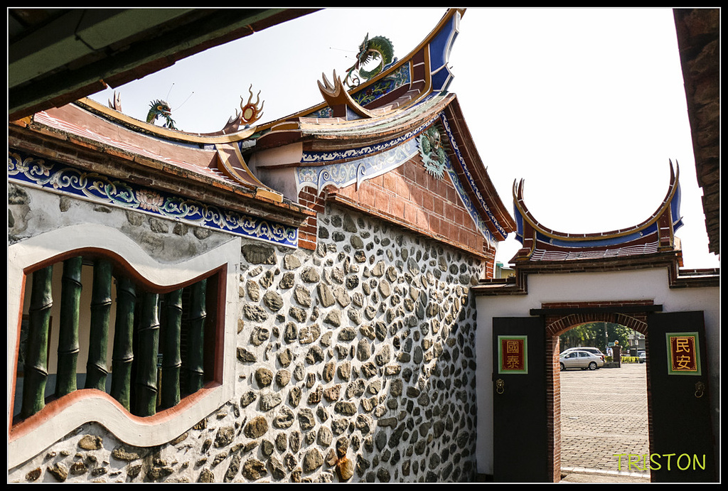 護龍旁卵石為主之亂石砌,兩邊的山牆懸魚是獅頭的造型,右過水廊外牆設有竹節窗牆,內側開口為方形,外觀則為書卷窗