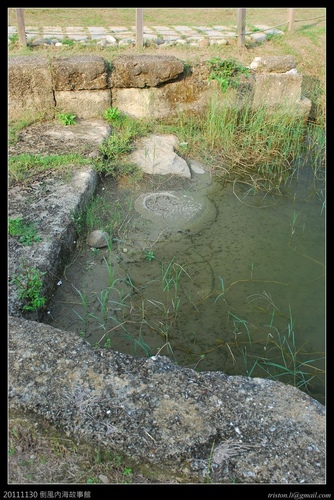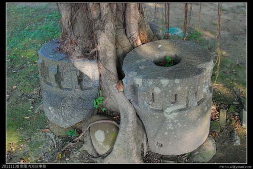碼頭坡道末端還可以看到石車的遺跡。傳說中乾隆皇帝聽說這裡有出天子的風水,所以派風水師以36個製糖用的石車填入水池,破了這裡的風水。然後原本在這裡鎮守的五府千歲出走,漂流到南鯤鯓,所以南鯤鯓代天府的千歲