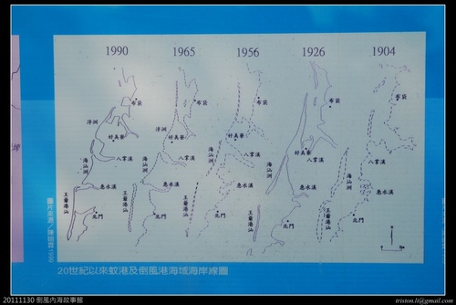 近一百年海岸線的變化,記得以前爸曾說由新營要去南鯤鯓代天府要坐竹筏,住台南金華路的同學也說小時候台南市政府所在的五期重劃區也都還是海灘,現在都蓋起大樓,人家說滄海桑田,只是沒想到這麼明顯。