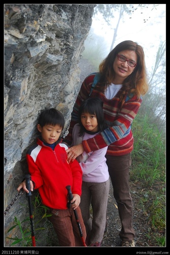 父子斷崖的由來,是因為該地路徑陡峭,山壁易落石坍方,地勢非常險惡,父子如果同行,因恐父救不了子、子救不了父的驚險而得名。不過今天霧雨濛濛,的確不太適合往前走了,但是這裡的岩理和斷層破碎面明顯,剛好找空地給小朋友上個地球科學的板塊運動。自從看了"2012"的末日電影後,小朋友問了不少板塊運動的題目,今天就一併實地上了堂地質課。