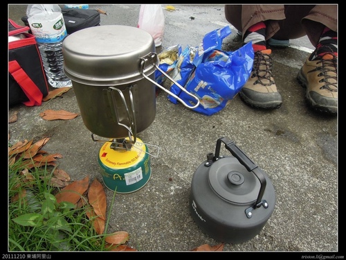下山,車還在,驅車至開高巷的托兒中心的籃球場,今天的中餐就在此解決了。把傢俬都擺上來吧。一具爐頭,一點高山瓦斯,就可以弄出一頓飯囉!我們可真夠簡約的啦!