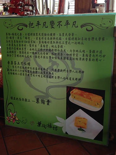 但是如果誤以為葉陶楊坊是葉陶或楊逵開的餐廳,那就是一個美麗的錯誤了!詳細的故事起源就要前往"葉陶楊坊"的網站去仔細端詳。其實新化這個小鎮,也出了不少名人,除了葉陶和楊逵,民國四十年代著名的影星"歐威"也是新化出身,前幾個月到"東成醬油"總店還發現小小的"歐威紀念館"。