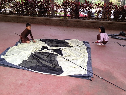 就搭在旁邊空地吧!今天的帳篷就決定交給我們的兩個小童工!我們這兩個小朋友,雖然年紀沒多大,但可是累積了六七十次的露營經驗囉!