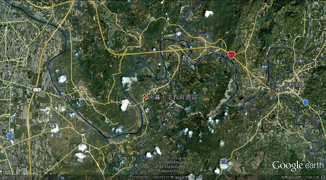 由空拍圖來看,曾文溪從玉井方向的山區穿山而出後,遇到堅硬的地質向北延伸又曲流向西,蜿蜒旋迴後終於在大內附近進入開闊地,繼續往善化方向西行!