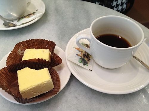 兩塊附贈的Cheese cake...還有點冰,應該要等回溫再配咖啡更好,老婆點了杯曼巴,價錢一般,兩杯咖啡附贈cheese cake 一共250元。比一些重氣氛的咖啡店還便宜,而且這裡接近長榮誠品,走過來就可以。對了,忘了問,這裡的咖啡可以續杯嗎?