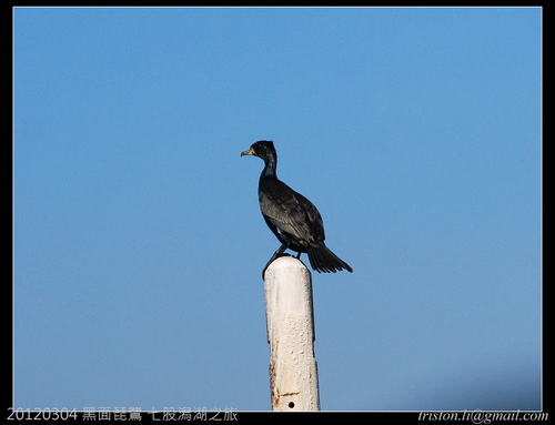 蚵架上站了一隻鸕鶿,這就是我們一般常稱的魚狗或魚鷹,就這樣站著,竹筏轟隆隆的過去也不以為意,想來看遊客也看得多了。