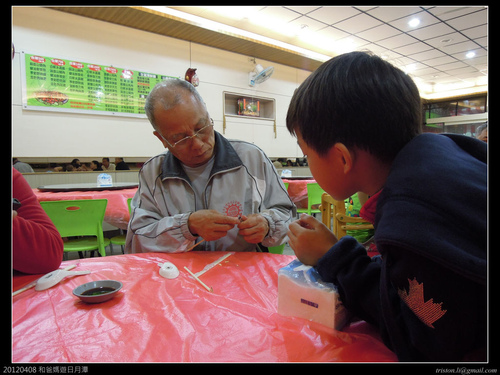 晚餐前阿公和孫子合力要修復被肢解的雨傘!