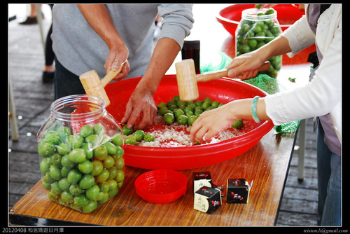 上水里農會網站預約就可以參加的醃青梅活動,醃梅子之前,要一一打爆梅子,我眼前那位女士的怨念很深哦!