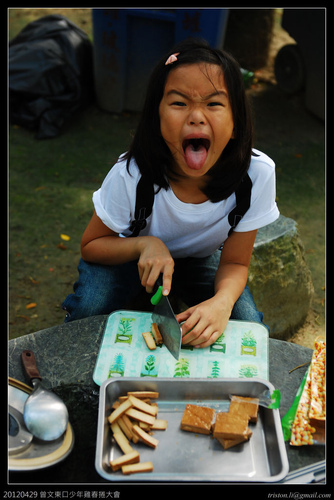 配合春捲大會,芝儀的主菜是切豆乾,雖然不用動火,不過動刀也很令人擔心!瞧她可是很認真的下刀哦!
