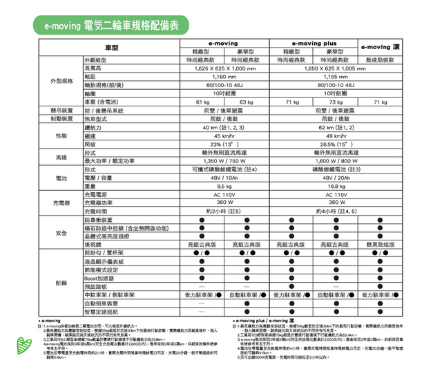 選的是中華汽車出產的e-moving plus精緻型。原因為1.中華汽車e-moving採用的是磷酸鋰鐵電池,比大部份的鉛酸電池或鎳氫電池好很多,電池領域我並不太了解,這部份是聽從同學在電池領域學有專精的建議。2.e-moving plus的電池蓄電力較強,是e-moving的2倍,也就是續航里程達二倍,但是plus的電池不方便取出充電,但這點對我們自有車庫的住民較不成問題,但對住大樓的住民或許是重要考量(e-moving的電池可直接拉取上樓充電)。3.精緻和豪華型的差異主要在自動駐車架的有無,自動駐車架的功能對身小體弱,或在都市緊迫空間的使用者應該蠻需要的,試過自動駐車架的功能的確蠻神奇的,它可以一鍵停車。不過由於e-moving plus的車重才71kg,經實際和老婆試過發現不會很難拉高起來停車,再者考量"自動的"東西日後總是有維修的可能,所以最終選了e-moving plus精緻型。
