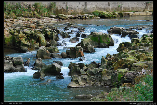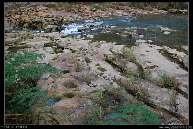 大約走個五分鐘,就可以看到河道上的壺穴地形,遠遠看可能不太清楚,壺穴是急流挾帶砂石在岩石河床上磨蝕而成的圓形凹穴